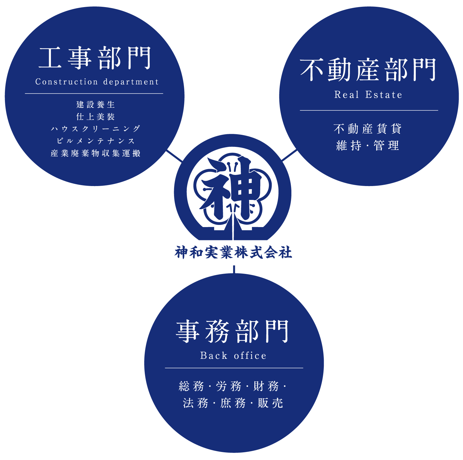 神和実業株式会社は、主に工事部門・不動産部門の事業から成っています。ことに工事部門では、建築養生作業・ビルメンテナンス・産業廃棄物収集運搬までをトータルに担うことで、建設現場の環境改善や建築物の価値向上のために先駆的な役割を果たしながら今日に至っております。近年では不動産事業にも力を入れ、事業を拡大いたしました。これからも、事業を通して人と地球の環境をより良くするために日々邁進してまいります。